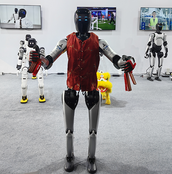 远征A2全尺寸人形机器人在进行快板表演。人民网记者 唐小丽摄