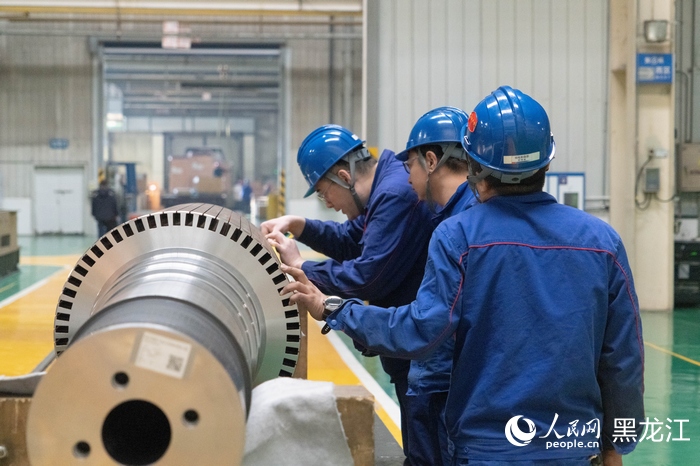 哈电集团动装公司工作人员正在检查部件。人民网记者 徐成龙摄