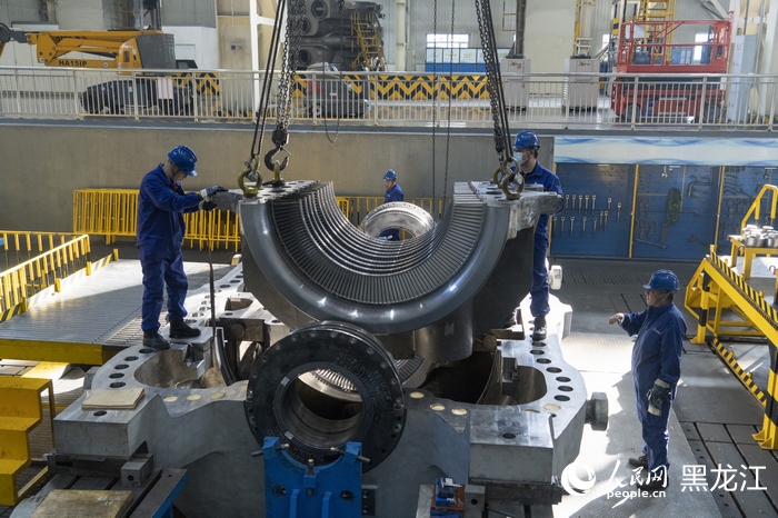 哈尔滨汽轮机厂工人进行吊装生产作业。人民网记者 徐成龙摄
