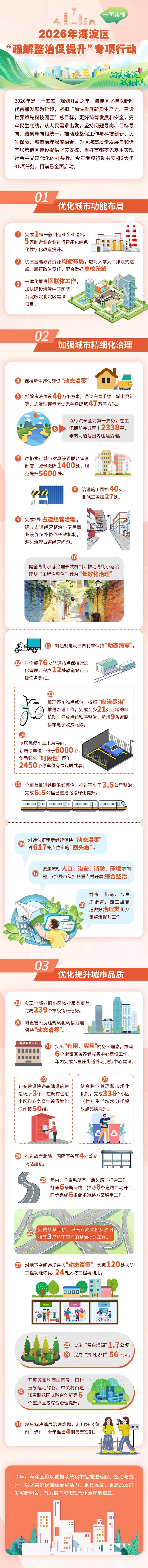 人民网北京4月9日电 (记者董兆瑞)记者从海淀区获悉,2026年海淀区“疏整促”专项行动3大类31项任务目前已全面启动。根据计划,年内将拆除违法建设40万平方米,主汛期前完成至少2338平方米河道范围内违建清理,新增停车位不低于6000个,推进故宫北院、国际医谷等4处公交场站建设,并实现“揭网见绿”56公顷......