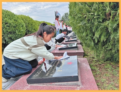 独树镇红军小学学生擦拭烈士墓碑。 |