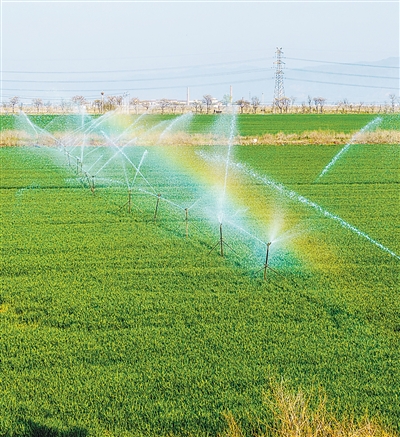 山西省永济市虞乡镇的农田里,现代化喷灌设备正在开展春灌作业。 |