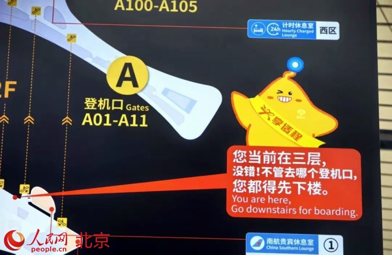 这还没完。过了安检,面对四通八达的指廊,小吴正琢磨登机口在哪儿,一块大屏幕又主动“搭话”:“您当前在三层,没错!不管去哪个登机口,您都得先下楼。”