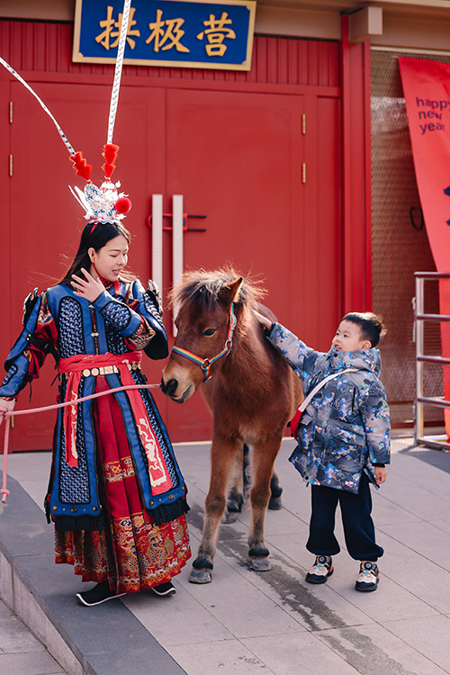 庙会还发布了“新春寻马令”,游客在宛平城内寻找“毛绒小马”或与马元素合影,即可兑换文创礼品。九省荟萃的美食市集、拱极营前的东岳太极路演、“马上发财”骑马旅拍等活动,进一步丰富了游玩体验。