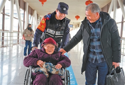 南京铁路公安处海安站派出所民警在江苏海安火车站帮助行动不便的旅客进站乘车。 |
