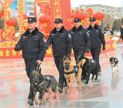 甘肃省张掖市公安局警犬大队民辅警牵着警犬在市中心广场巡逻执勤。 |