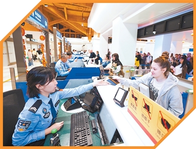 海南海口出入境边防检查总站凤凰边检站执勤民警为旅客办理边检手续。 |