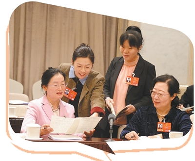 北京代表团开放日现场,阮祥燕代表(左一)、管文会代表(左二)、吴华侠代表、闫傲霜代表(右一)在会议后讨论。 |