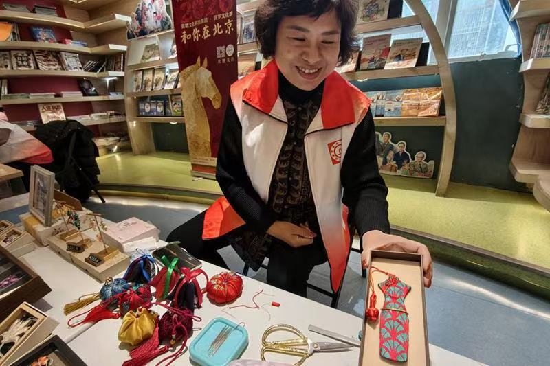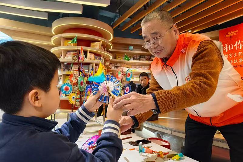 在活动现场,风车制作技艺非遗代表性传承人、北京民间艺术大师王国华手把手指导小朋友制作传统风车,孩子们在转动中感受老北京的年味。京式旗袍传统制作技艺市级非遗代表性传承人张凤兰则带来了精美的旗袍款书签,将非遗技艺与阅读巧妙结合。铜胎掐丝珐琅(景泰蓝)传承人杜静,作为师从北京市工艺美术大师、张氏珐琅第三代传人张玉安的年轻一代传承人,将精美的景泰蓝文创产品带进书店,让传统技艺以更时尚的方式走进现代生活。